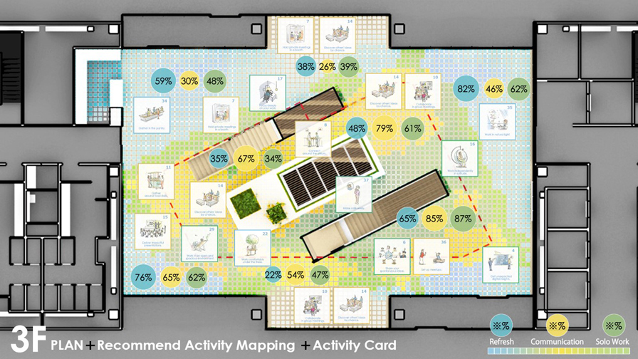 水原:我们提出了“搅拌活动”的概念,有意识地设定人们在空间中的活动和交流方式。为此,我们开发了一种叫做“活动卡”的工具。在共用空间的各个地方将“此处可以进行什么活动”的具体提案写在卡片上,并放置在图纸上,以此来实现活动行为的可视化。这有助于我们与客户、日建设计建筑团队以及竹中工务店团队更加直观地共享设计方案。