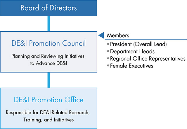 In line with the above DE&I Statement, Nikken Sekkei has established both quantitative goals and qualitative action plans as company initiatives. In 2025, we launched the DE&I Promotion Office, which serves as the core entity driving all DE&I-related initiatives. The office brings together seven members from a wide range of disciplines across both business and administrative divisions. Their diverse backgrounds—ranging from parenting and caregiving responsibilities to non-Japanese nationalities and regional residency—reflect a variety of working styles and perspectives. Leveraging these diverse experiences, the office is responsible for planning and implementing effective and inclusive strategies. We also hold the “DE&I Promotion Conference” four times a year, chaired by our President. This conference monitors the progress of department goals toward our “2030 DE&I targets,” ensures the alignment of appropriate roadmaps, and supports steady execution of action plans toward achieving the goals.