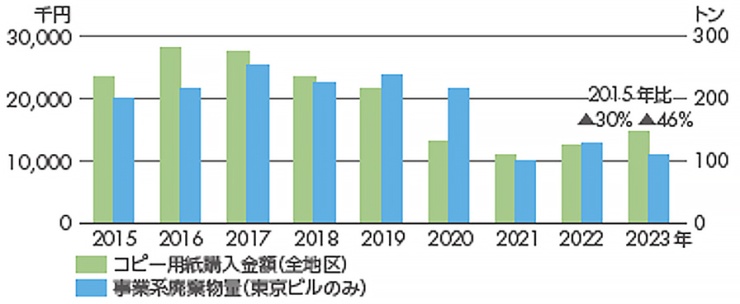 The establishment of digital workplaces around 2020 significantly accelerated the promotion of paperless operations and waste reduction. Subsequently, it was confirmed that waste levels had been maintained without significant increases. Copy paper usage per employee (across all offices) was reduced by 41% compared to 2015, and waste at the Tokyo Building was reduced by 44% compared to 2015.