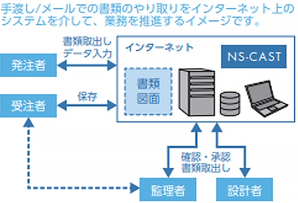 With NS-CAST, a complete storage system for construction-related documents developed by Nikken Sekkei, data information sharing, storage and management of books and documents is carried out between Nikken Sekkei, the client and contractor to enhance the system of paperless operation at each construction site. This system is expected to contribute to (1) taking risk management measures, (2) reducing administrative costs, (3) building a database, and (4) ensuring the execution of Construction supervision work.