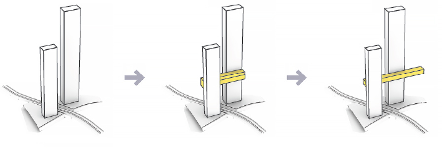 The construction of standalone skyscrapers on a site divided by an expressway raises issues in function and effective operation.