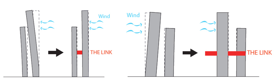 In designing a 300-m tall skyscraper, structural design becomes an issue to counter swaying in strong winds. We proposed to connect the two skyscrapers with a linked bridge to effectively control swaying in strong winds.