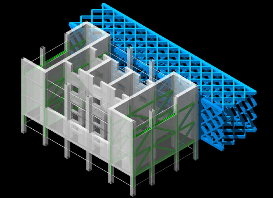 Generally, skyscrapers in Dubai are designed with a structural system that mainly uses inexpensive concrete. Compared with skyscrapers in Japan that are mostly designed using steel structures, column sizes are significantly larger, which reduces the floor space that can be used effectively. When designing the structure, we applied Japan’s expertise in structural design and adopted a cost-effective composite structural design with the placement of steel frames inside concrete columns to reduce the size of the columns by 30% to 50% and increase available floor space. To safely support THE LINK, a composite structure was used to strengthen the connection points to the towers with the placement of high-strength steel braces (green) inside concrete walls (white).
