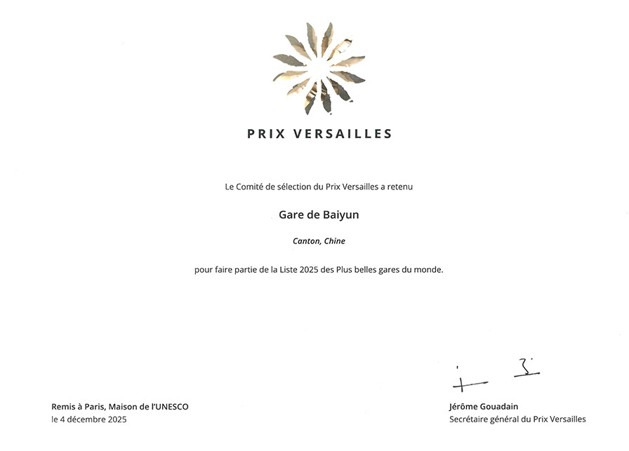(Tokyo) – The Nikken Sekkei-designed Guangzhou Baiyun Station in China has been selected as one of seven “World's Most Beautiful Stations” for the 2025 Prix Versailles. The award ceremony was held on December 4 at UNESCO Headquarters in Paris. Representing the company at the event were Byung Gyoon Jung, Design Director of the Design Group in the Global Architectural Design Department, and Jan Henckens, General Manager of the Global Business Development Group in the Global Business Department.