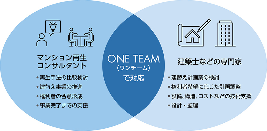 マンション再生を専門とするコンサルタントや、10万戸を超える集合住宅設計の経験をもつ建築士らがワンチームとなり、豊富な知見を生かして総合的な視点からマンション再生をご支援します。