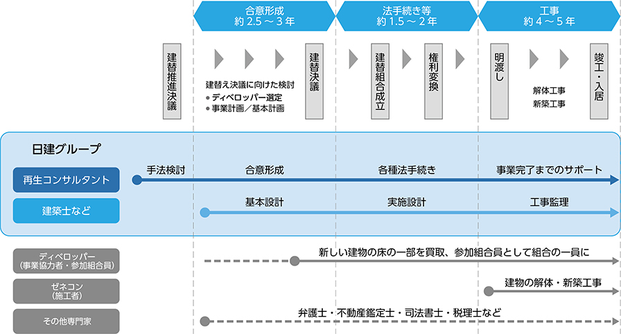 日建設計は再生コンサルタントとして、また設計者として、最初のご相談から権利者のみなさんとともに再生実現に向けて伴走します。