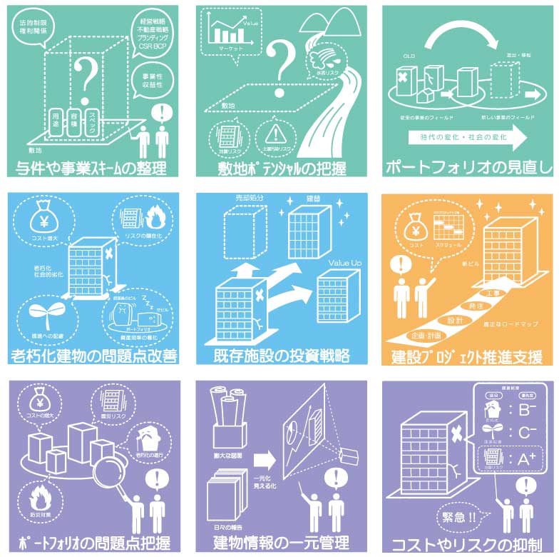 不動産業を本業としない企業などから見れば、自社施設の建設は何十年に一度かの一大イベントであり、むしろ建設に至るまでの準備段階や運用段階の方が圧倒的に長いのが通常です。例えば、建物を建てて築年数が経過してくると、維持管理運営での課題が出てくるため、今後建替えたほうが良いのか、または改修して活用するほうがよいのか、施設全体をポートフォリオとしてとらえたときにどのように価値向上を図っていくか、といったお悩みもお持ちだと思います。また、建設までの準備段階においては、「こういう条件で設計を依頼したい」と明確に決まるまでには、敷地の選定、事業スキームの整理、設計与条件の整理、といったように多くの検討事項が発生します。