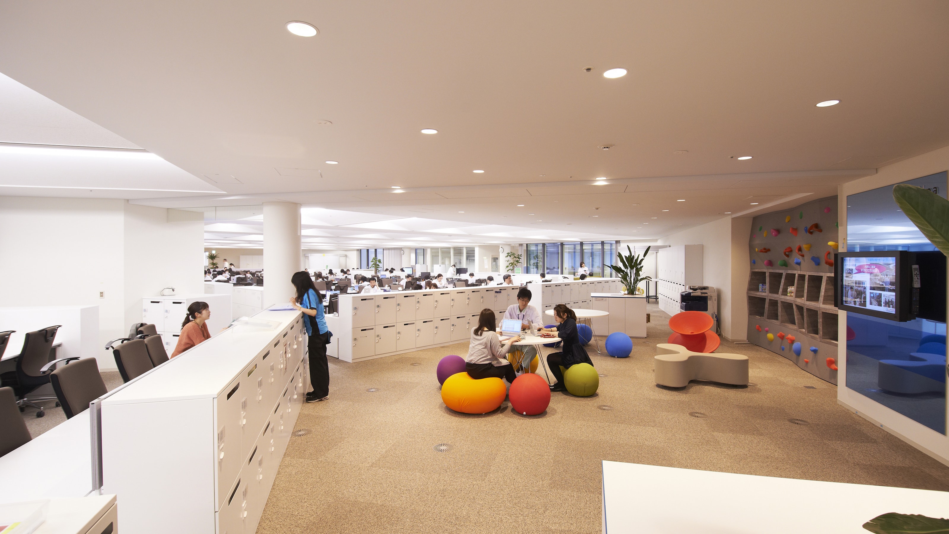 まずは思い切って会議室そのものを削減。その代わりとして、コミュニケーションが生まれやすいオープンな打ち合わせ場所をたくさん作りました。ランチタイム以外は食堂も利用、各自のデスクを固定しないフリーアドレスを導入するなど、ワークスタイルに関わる点まで提案しました。
