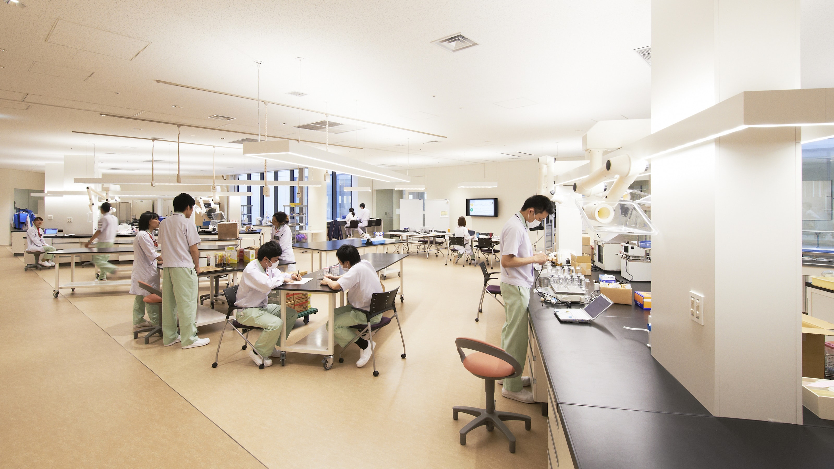 こうして出来上がった新社屋「仙川キューポート」は、広い視野を確保し常にお互いが見える“三角形オフィス構成”、グループ会社の相乗効果を最大限に発揮するために研究所階とオフィス階を交互に重ねる“ミルフィーユ構造”を特徴とした、それぞれの会社や部署間のコミュニケーションが密になる工夫を凝らした施設となりました。