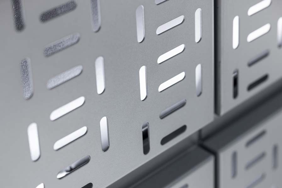 仕上げ材にケーブルラダーを採用。パンチング開口を利用した間接照明が落とす光と影で近未来的な空間を演出