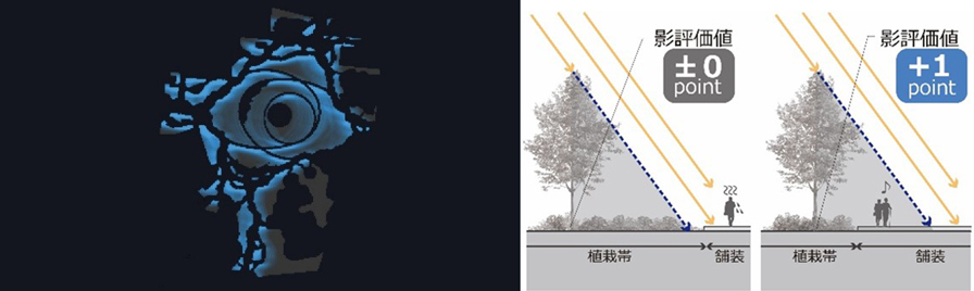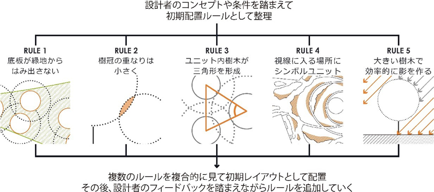 まず、EXPO70の万博記念公園などから移植された樹木を含む約1500本全てについて、樹種や高さなどの情報を記録。そして、舗道に多くの影が落ちる、自然の森が感じられるよう高さや樹種が違う木を3本ユニットにする、などいくつかの設計ルールがありました。そうした設計ルールと地下の配管と木の根が干渉しないなどのさまざまな条件を勘案しながら、樹木の配置をDDLがシミュレーション。1500本という大量の樹木を、デザインコンセプトに即して効率よく自然の森を感じられるデザインとすることに寄与しました。