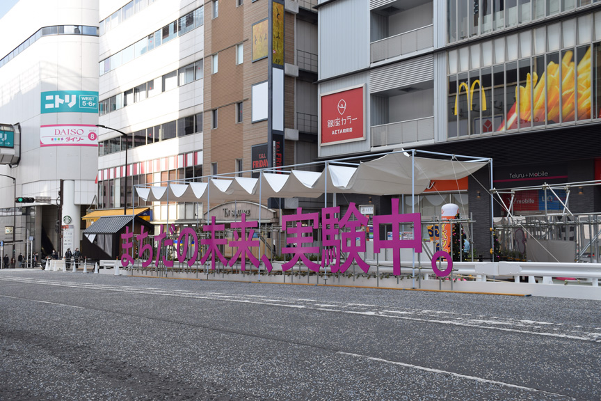 日建設計が入る以前から実験を行ってきましたが、(道路使用許可が下りず)道路を使うことができなかったので、2018年度は、近隣の大型商業施設(町田東急ツインズ)の公開空地を仮想の道路と見立てて使わせてもらいました。2019年度は、原町田大通りをただ通行止めにするという実験を行いましたが、車両の通行を止めると警備費用がかかり、交通事業者や沿道店舗などとの膨大な調整も必要だということを学びました。2020年は、原町田中央通りまで検証のエリアを広げて、荷捌き車両のスペース確保や歩道拡幅に関する実験をしました。こうして実績を積みながら、ようやく2021年度に日建設計と一緒に車道を使った社会実験をすることができました。