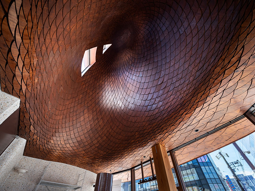 柔らかさと懐かしさを演出したかったので、昔の民家で使われたような「うろこ張り」を模した雰囲気になっています。屋根全体に網を被せたようなパラメトリックデザインで、コンピュータでシミュレーションして約3,000枚の異なる形状のタイルをつくりました。