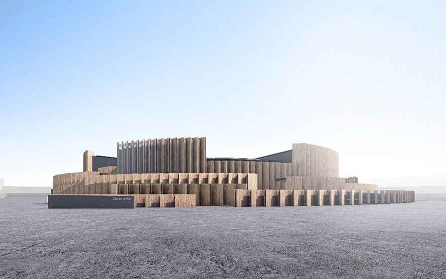 日本館は、日本政府が出展するパビリオンです。国産杉材によるCLT(直交集成板)を、構造耐力を有する内外壁として活用しており、CLTを雁行させながら円環状に無数に並べることで、「いのちのリレー」や「いのちの循環」といったコンセプトを建築として体現しています。会期終了後には日本各地でリユースされることを前提に設計されており、できるだけ傷をつけず、容易に取り外しが可能な構造となっています。CLTとCLTの間にはサッシを用いず縦長の大判ガラスを直接はめ込むことで、繊細なディテールを追求し、隙間から内部を垣間見ることができる設計となっています。このように、「中と外」が連続することで、展示と建築が一体となったパビリオンを目指しました。