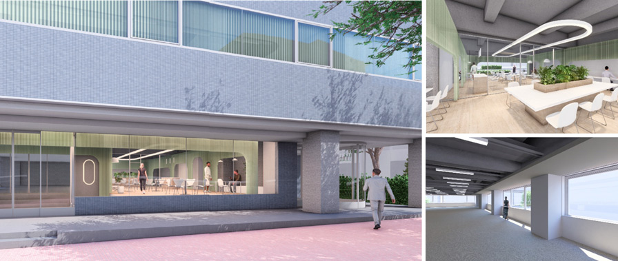 さらに1階は、テナント区画とオフィス専用ラウンジを計画し、間仕切りにより機能を分けます。オフィス専用ラウンジは、集中して仕事をする場所、イートインスペース、外部ゲストとの打合せやイベント開催等、多様な使い方を受け入れる共用拠点として整備し、テナントのウェルビーイングの向上や生産性・利便性の向上につなげます。