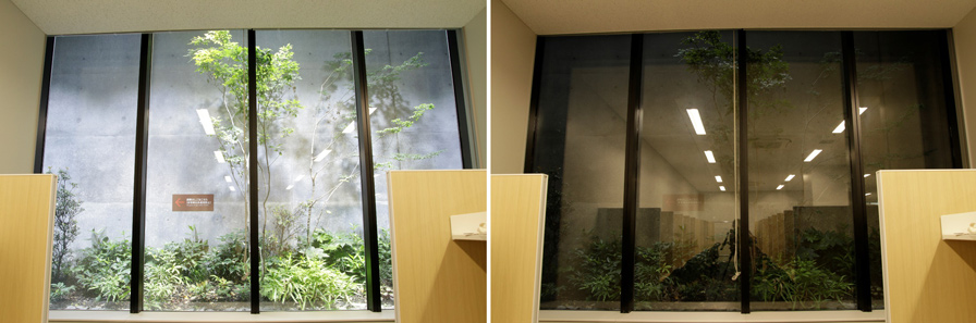 地下空間に設置した自然光模擬照明(左:点灯時、右:消灯時)