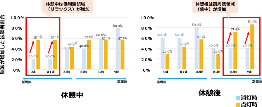 自然光模擬照明の点灯下では、消灯時と比較してリラックス状態を示す低周波帯域(θ波、α1波)が増加した被験者の割合が多い結果となりました。休憩時の脳波を測定・比較したところ、θ波、α1波ともに消灯時の20.0%に対し、自然光照明点灯時は57.1%を示しています。